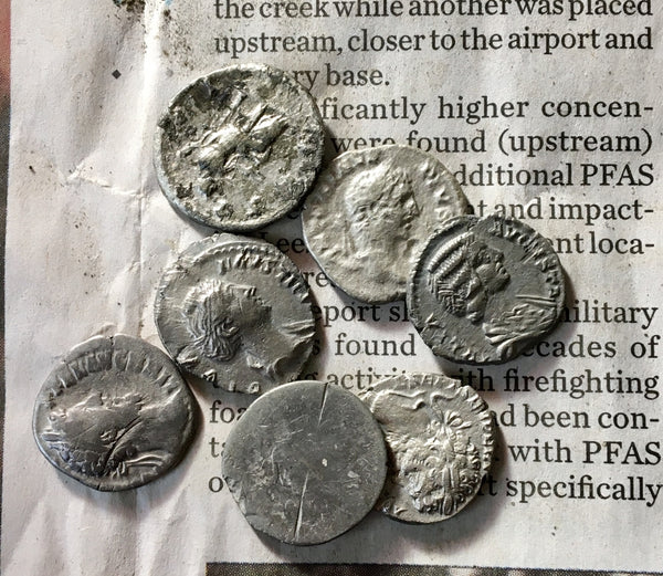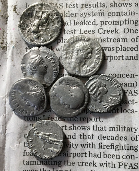 In this lot of Ancient Roman imperial Silver coins all have the original patina, tone, on them and are uncleaned shape as in the photos. Not cleaned and with all uncleaned maybe a ancient fouree.  Every coin will be different and some are rarer Roman empresses coins in this lot of denarius and since they are really uncleaned you never know what you can find.